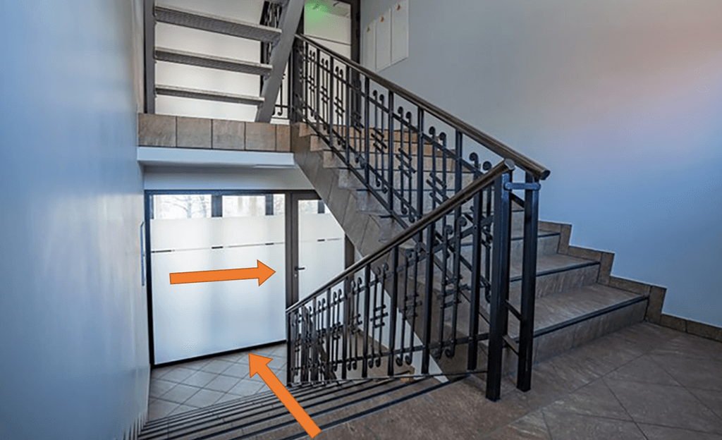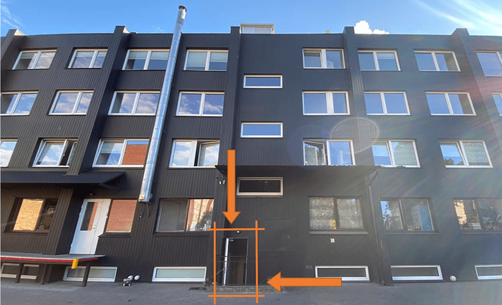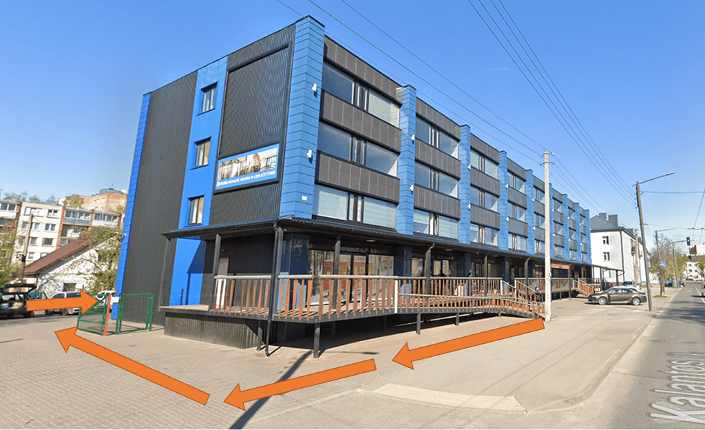 Įėjimas į patalpas ne iš gatvės, o iš kiemo pusės. Reikia apeiti pastatą taip, kaip nurodyta rodyklėmis pavyzdyje. Viduryje pastato – vienintelės durys į laiptinę. Patalpos cokoliniame aukšte (pusrusyje), todėl tiesiog nusileiskite vienu aukštu žemyn, tada rinkitės 001 kabinetą.